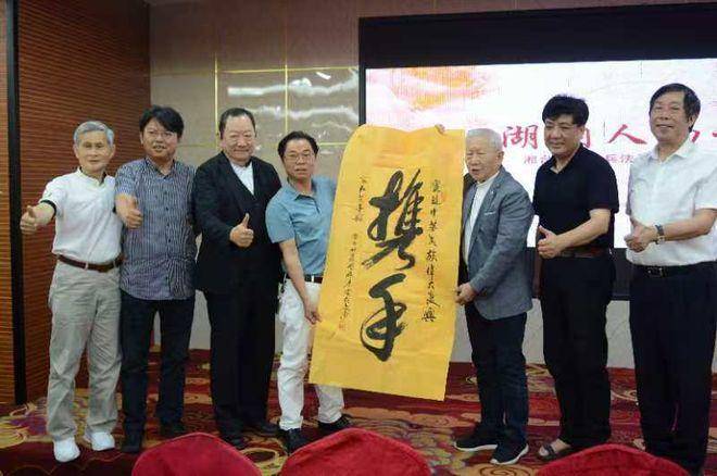 2023年6月曾昭才先生在长沙参加“湘台专家研讨孙子兵法,书法交流同根同源之心”活动期间,给台湾嘉宾赠送“携手———实现中华民族伟大复兴”书法作品。省政协原副主席刘晓、中国传统文化协会副会长伍继延合影留念。