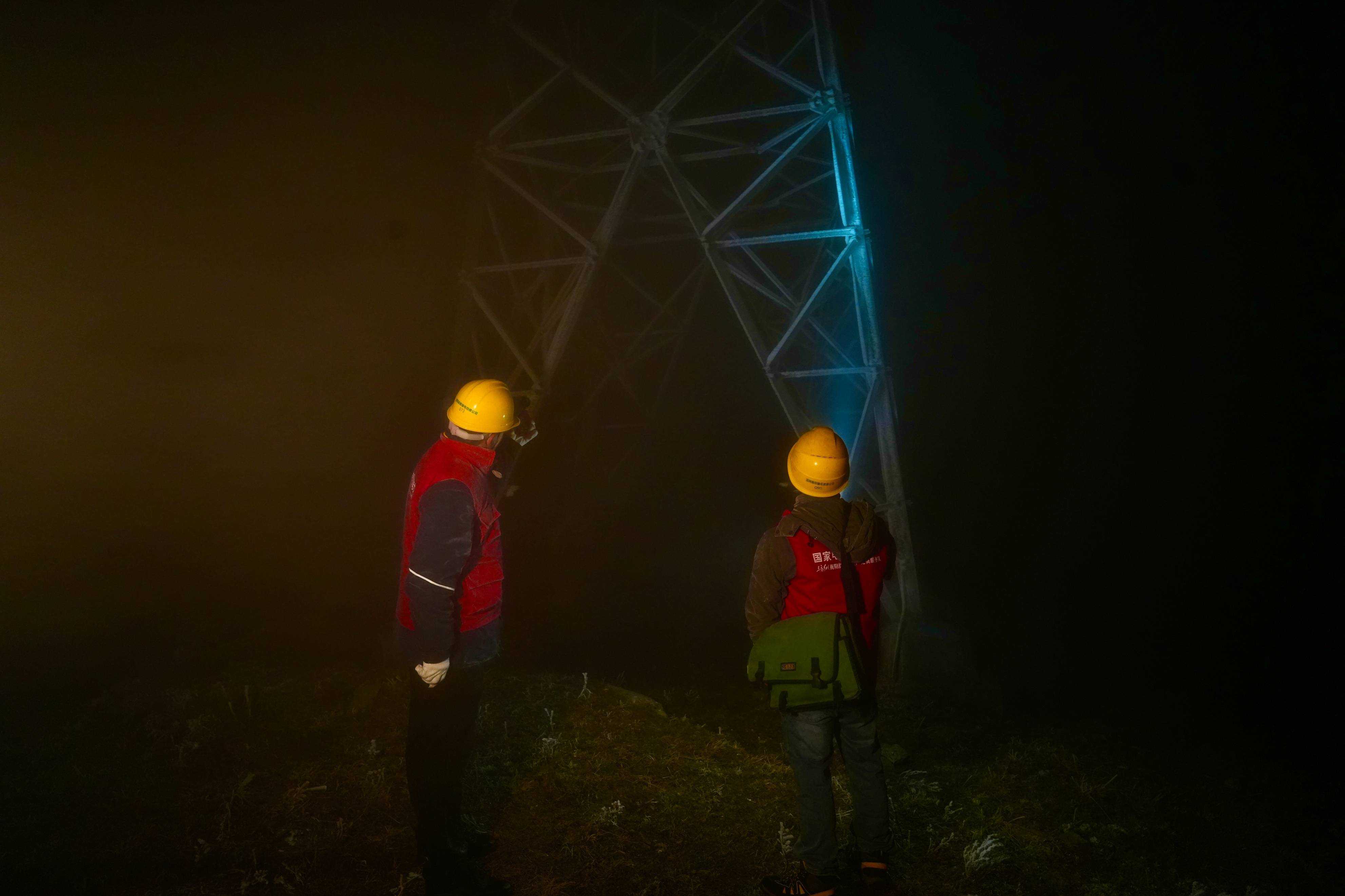 ▲工作人员夜间在天堂山110千伏印天线117号塔监测模拟导线覆冰厚度。汪继生摄