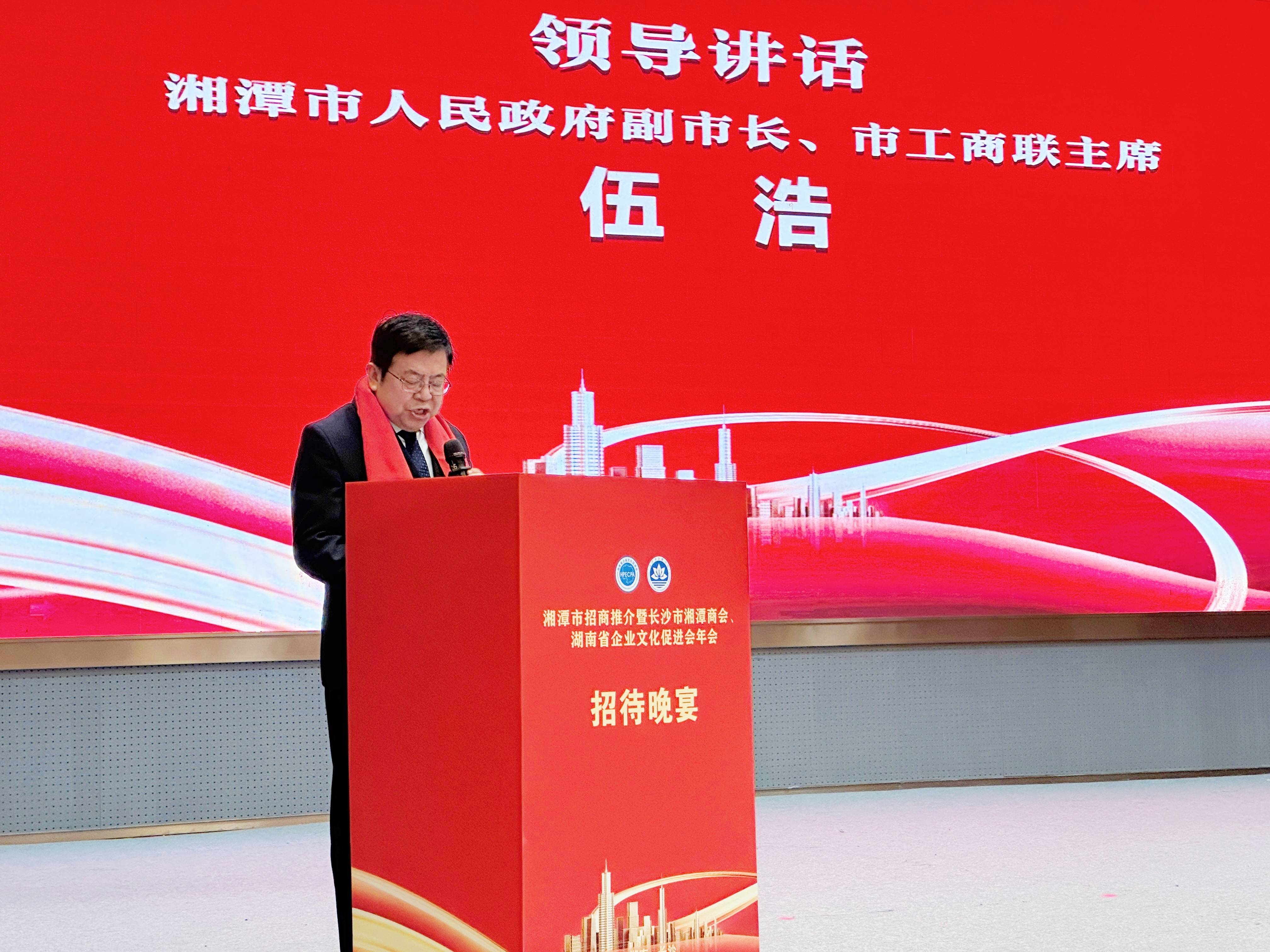 伍浩代表湘潭市委、市政府,向长期关心支持湘潭发展的各界人士致以诚挚感谢,对长沙市湘潭商会为家乡发展所做的贡献给予高度赞誉。他强调,湘潭作为长株潭都市圈核心城市,正从“老工业基地”加速迈向“新质生产力高地”,凭借坚实的产业基础、优越的区位优势和“亲商、安商、富商”的营商环境,成为承接产业转移、培育新质生产力的沃土。2025年,湘潭引进亿元以上产业项目93个,新注册“湘商回归”企业137家,“湘潭服务,相当专业”的营商环境品牌通过28条优化措施持续擦亮,在惠企政策直达快享、要素成本减负、政务服务提质等方面获得广泛认可;全市构建起以“三优三特”先进制造业为骨干的现代化产业体系,8条重点产业链“四梁八柱”基本成型,新能源汽车及配套、先进能源材料及电池产业链营收同比分别增长84.62%、87.09%,数字经济核心产业营收占比达13.7%,居全省前列,深度融入湖南“4×4”现代化产业体系建设。伍浩表示,诚挚邀请广大企业家走进湘潭、投资湘潭、深耕湘潭,市委市政府将以全周期、全方位的优质服务,与企业家们携手共谱高质量发展新篇章。
