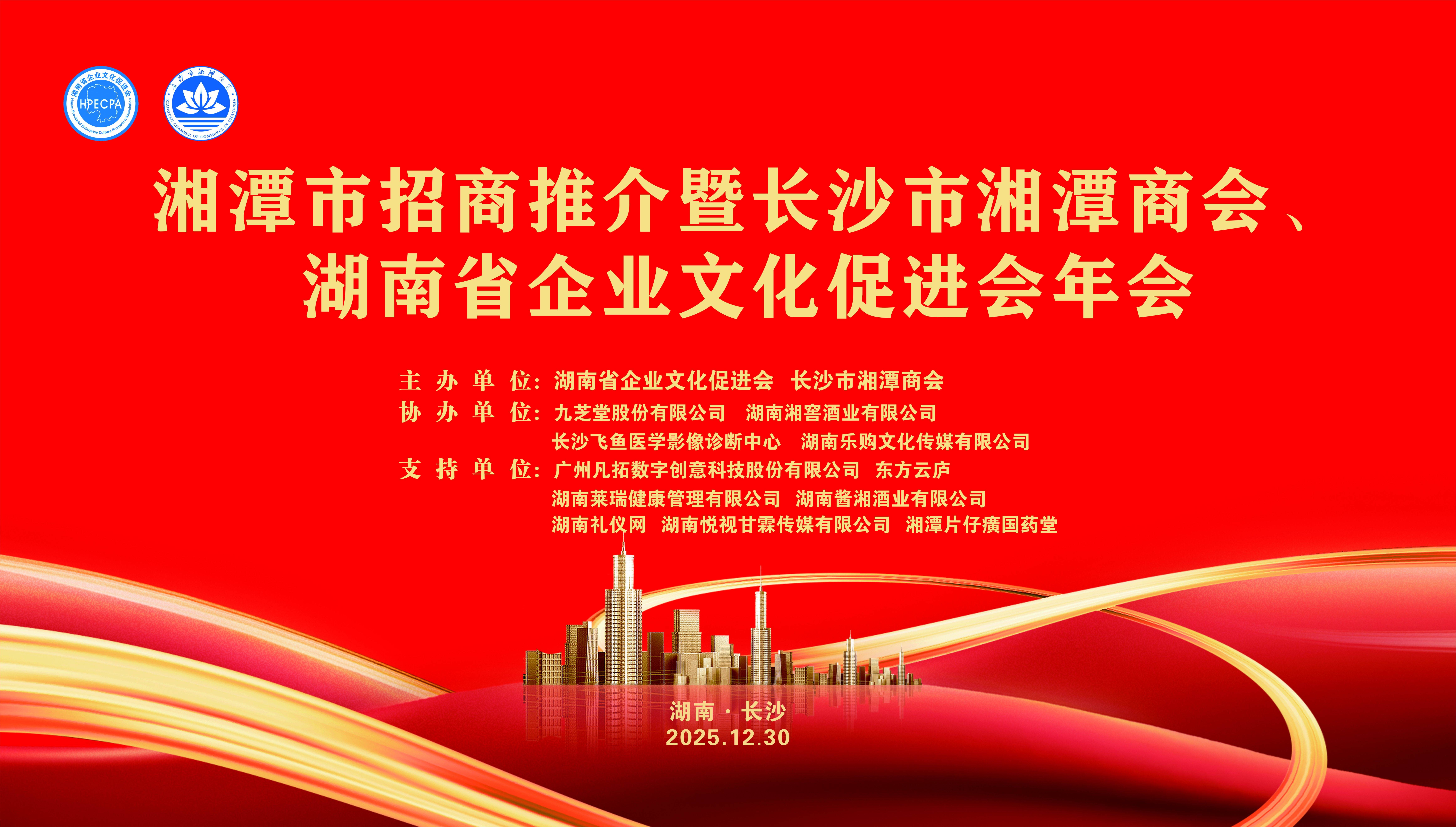 本次活动由长沙市湘潭商会主办,湖南省企业文化促进会联合主办,并得到了九芝堂股份有限公司、湖南湘窖酒业有限公司、长沙飞鱼医学影像诊断中心有限公司、湖南乐购文化传媒有限公司、广州凡拓数字创意科技股份有限公司、湖南酱湘酒业有限公司、湖南莱瑞健康管理有限公司、湖南悦视甘霖传媒有限公司、湘潭片仔癀国药堂、湖南礼仪网、河州甲鱼产业集团、东方云庐等单位的大力支持。