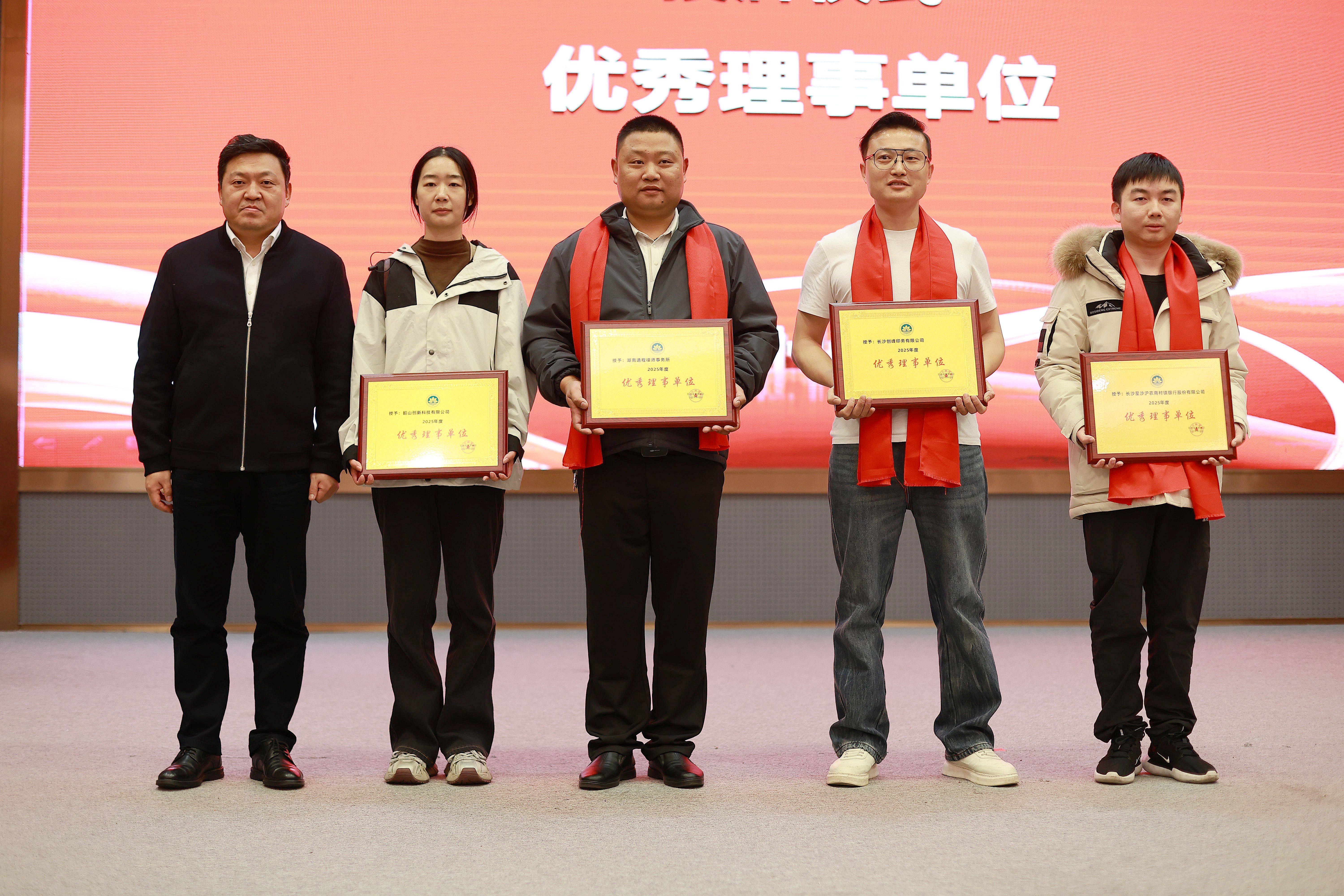 湘潭市委统战部副部长、市工商联党组书记姜伟为长沙星沙沪农商村镇银行股份有限公司、长沙创峰印务有限公司、湖南通程律师事务所、湖南楼女王汇科技有限公司、韶山创新科技有限公司5家理事单位颁发优秀理事单位奖牌。
