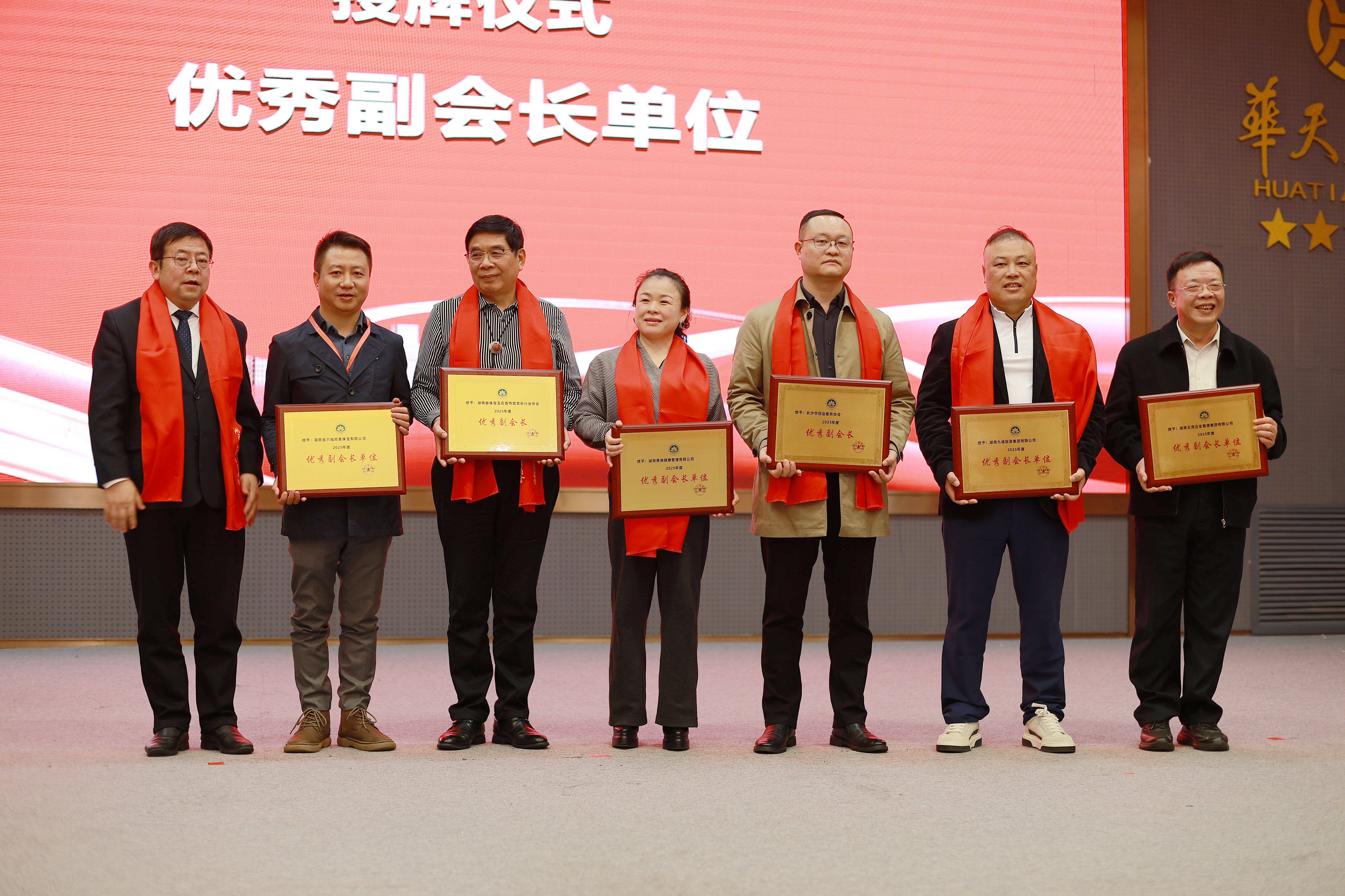 湘潭市人民政府副市长、市工商联主席伍浩为湖南九城投资集团有限公司、湘楚人力资源集团有限公司、湖南省珠宝玉石首饰观赏石行业协会、金六福尚美珠宝有限公司、湖南奔跑创业服务有限公司、湖南莱瑞健康管理有限公司6家副会长单位颁发优秀副会长单位奖牌。