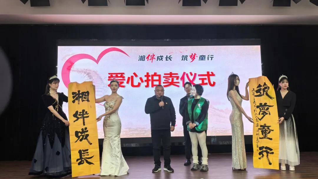 书画作品拍卖环节气氛热烈,谢建军先生倾情助力,特别捐赠知名书法家、胡图书院院长胡勇飞老师题写的“湘伴成长·筑梦童行”书法作品,以及著名画家、中美协会员、湖南省湘江书画院副院长左都建老师创作的精品国画作品。两幅佳作兼具艺术价值与公益情怀,一经亮相便引发在场爱心人士的踊跃竞价,大家慷慨解囊、争相举牌,用实际行动为困境儿童传递温情。此次拍卖所得款项将全额纳入“湘伴成长·筑梦童行”项目帮扶资金,为公益事业的长效推进添砖加瓦。