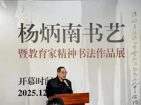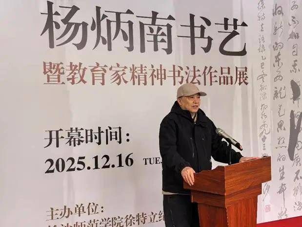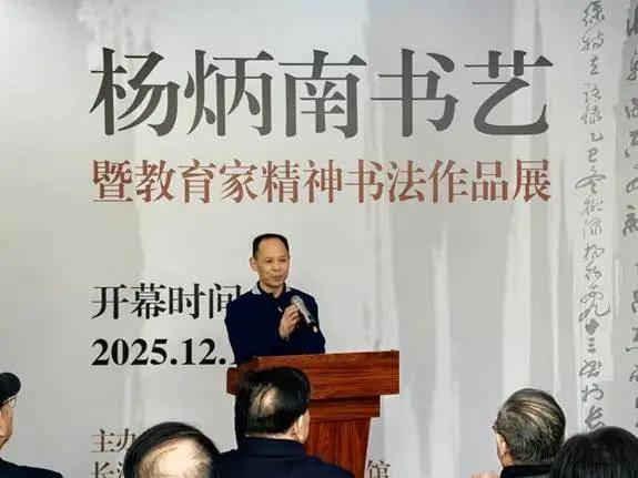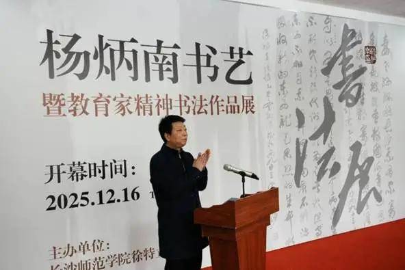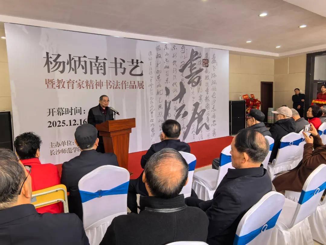 2025年12月16日上午,“杨炳南书艺暨教育家精神书法作品展”在长沙师范学院徐特立纪念馆隆重开幕。湖南省人大常委会原副主任、湖南省政府原副省长唐之享,湖南省人民检察院原检察长张树海,中国作家协会原副主席、湖南省作家协会原主席谭谈,中国书法家协会副主席、湖南省书法家协会主席鄢福初,湖南省文学艺术界联合会党组成员、副主席倪文华,湖南省文史研究馆党组副书记、一级巡视员彭英,湖南省文史研究馆副馆长、一级巡视员赵为济,中国书法家协会理事、湖南省书法家协会副主席兼秘书长胡紫桂,湖南省文联二级巡视员谢群,湖南美术出版社副书记鲁克雄、副社长蔡立乐,长沙师范学院校长伍春辉,长沙师范学院原校长曹晓鲜、原副书记周明侠等领导和嘉宾,以及社会各界人士100余人参加了开幕式。