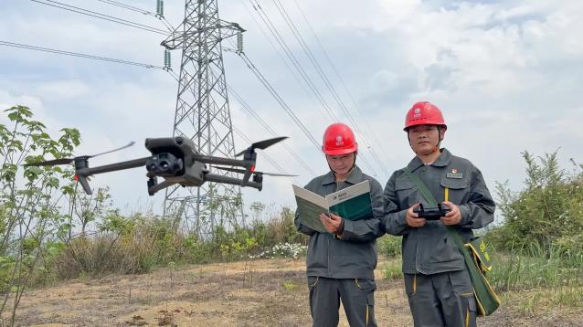 李军(右一)、张勇(左一)对110千伏立沙线进行无人机巡检