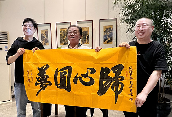 曾昭才向策展人李兵和藝術家印庵贈送自己的原創墨寶。