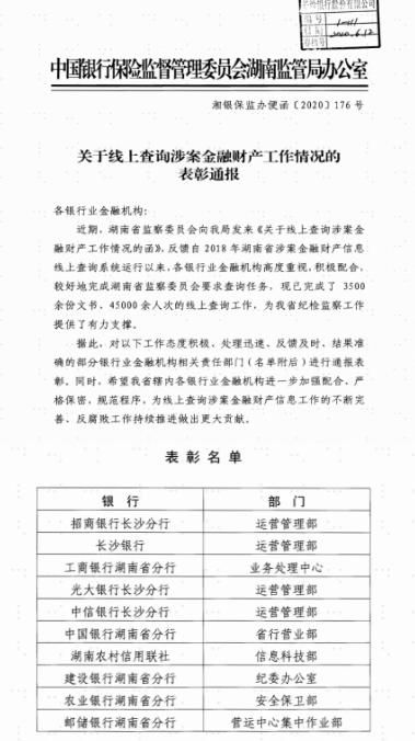 长沙银行线上查询业务荣获湖南银保监局表彰通报