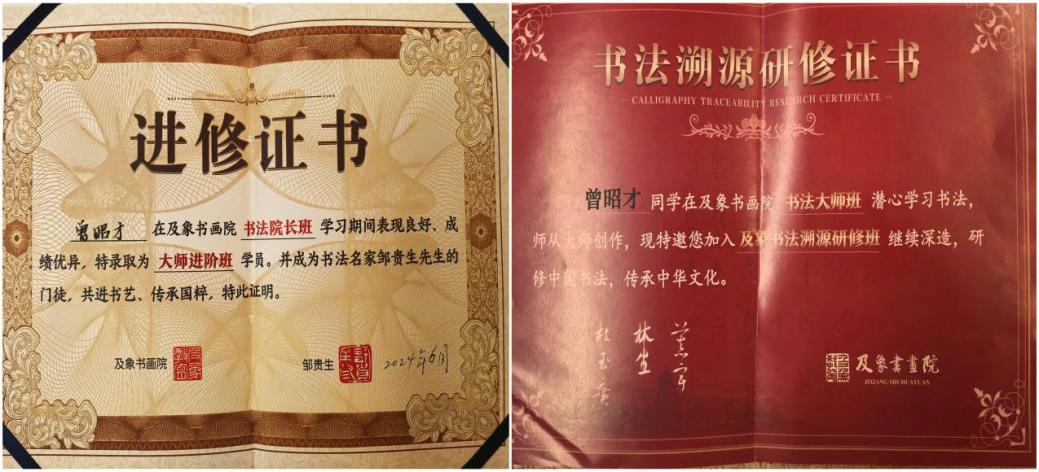 自 2022 年以来,曾昭才先生在在及象书画院学习期间,认真听课,刻苦钻研,艺术大升,不断晋级。4 年多时间,参加了 16 个长短班级学习。