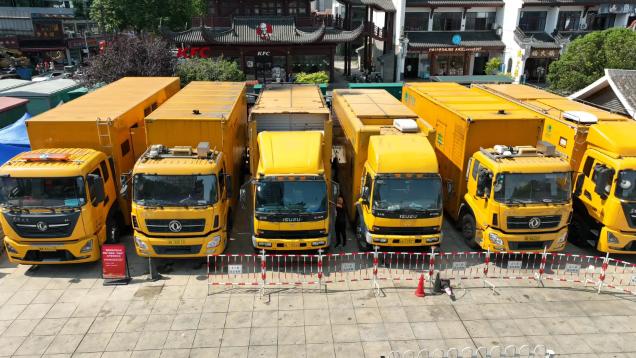▲5月22日,在岳阳巴陵广场湖南省第四届旅发大会开幕式现场,2台500千伏UPS应急电源车和4台500千伏安的低压发电车停放整齐,国网岳阳供电公司“电骆驼”共产党员服务队正在抓紧时间接入电源,确保开幕仪式供电“零闪动”。