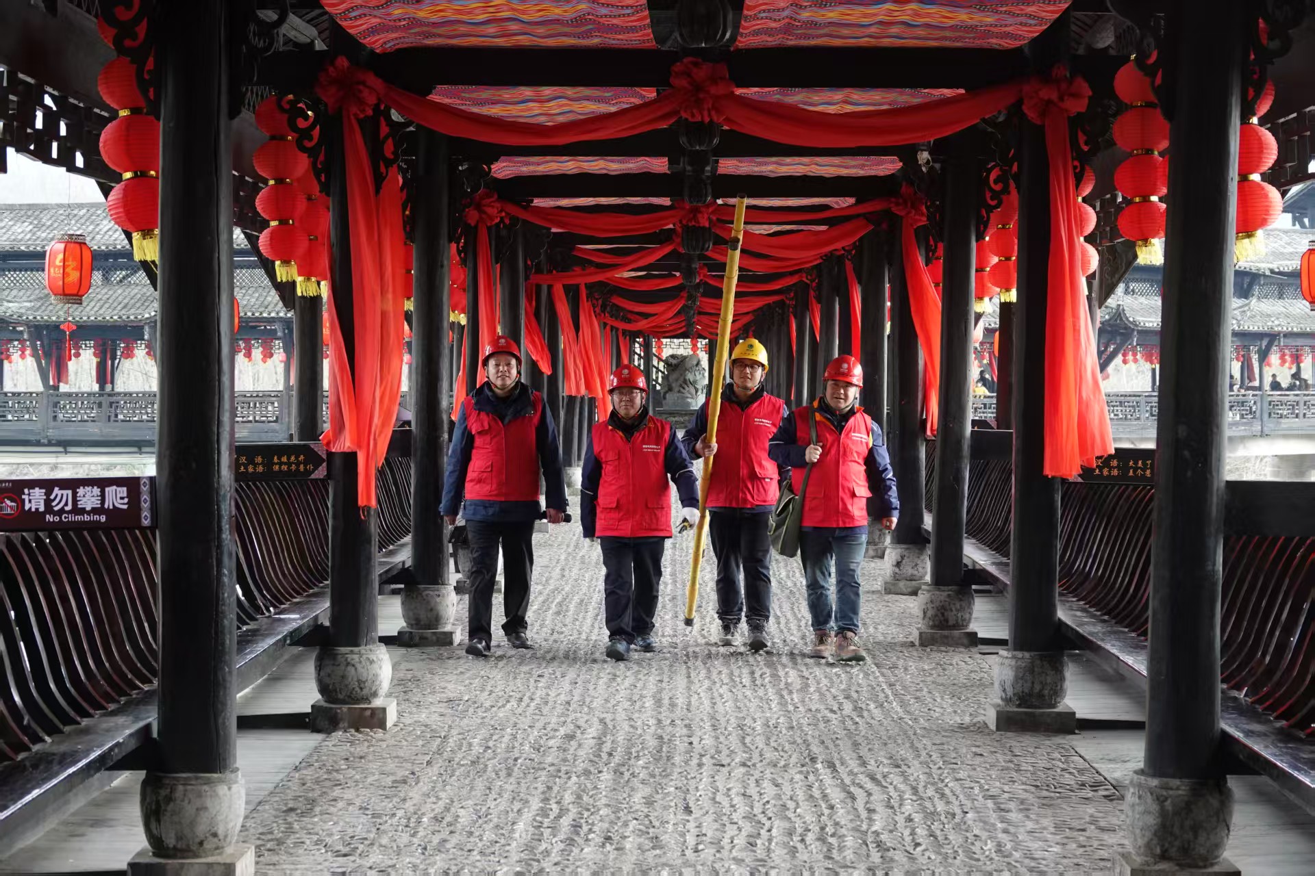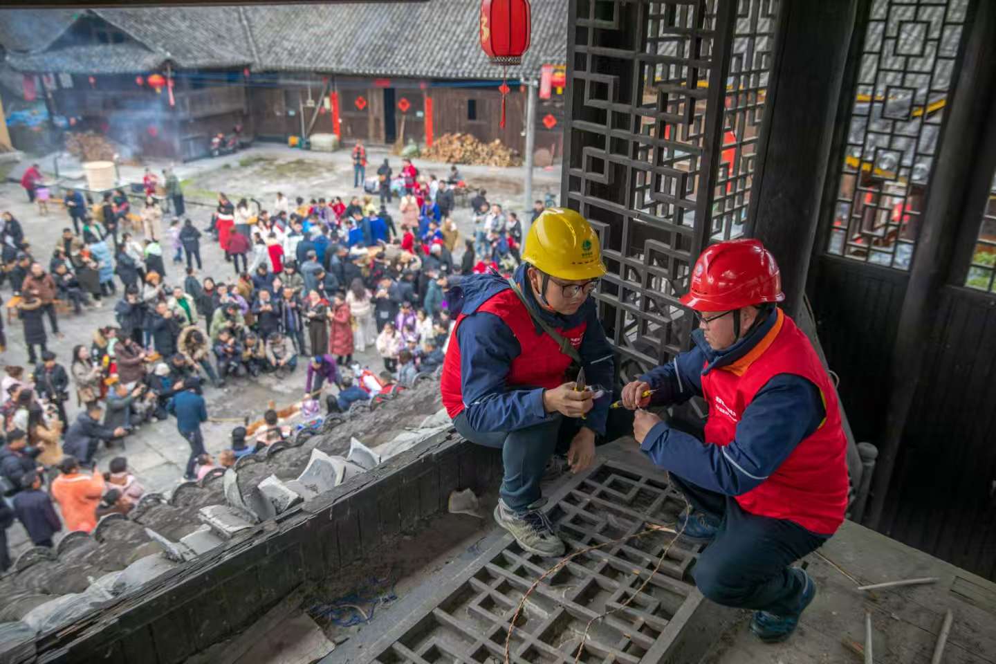 上午8时许,记者跟随湖南湘西龙山县供电公司田昌平、吴永峰等4名员工,一同踏入这如梦如幻的古寨。此时,一场以“快乐土家年”为主题的沉浸式年俗体验活动,正于这座千年古寨中徐徐铺展。数千名游客与村民从四面八方汇聚而来,欢声笑语回荡在每一处角落,现场热闹非凡。而在这浓郁得化不开的年味背后,一场保障电力供应的守护行动,正悄然拉开帷幕。
