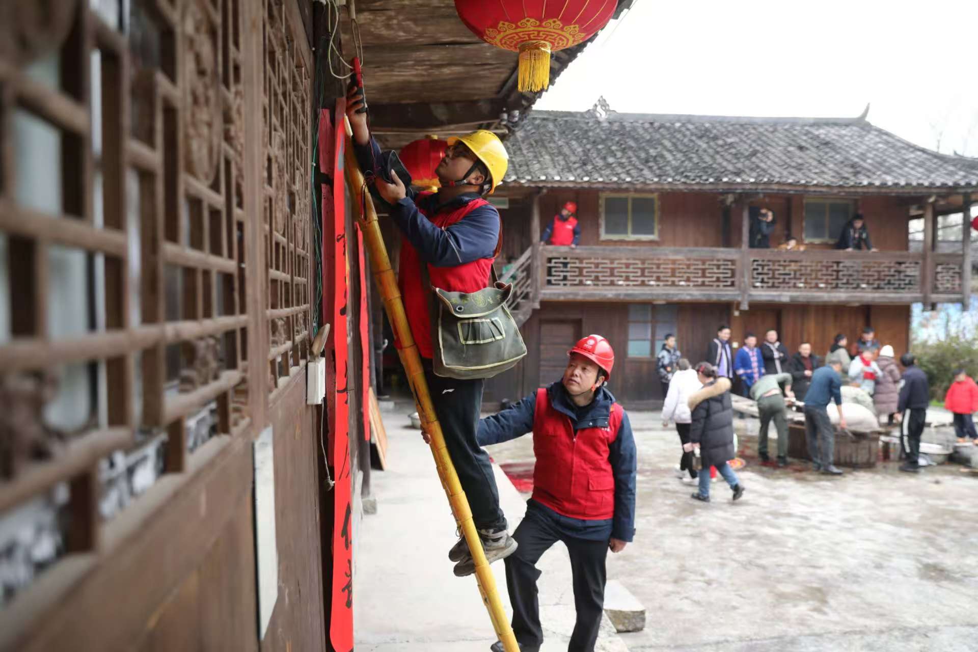 ▲2月15日,国网湘西龙山县供电公司员工在“中国土家第一寨”——惹巴拉古寨巡检电力设备,护航土家新春。